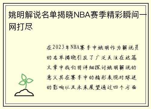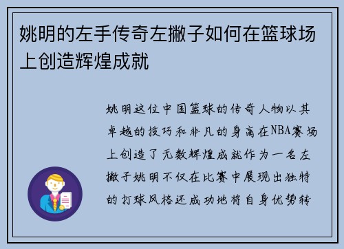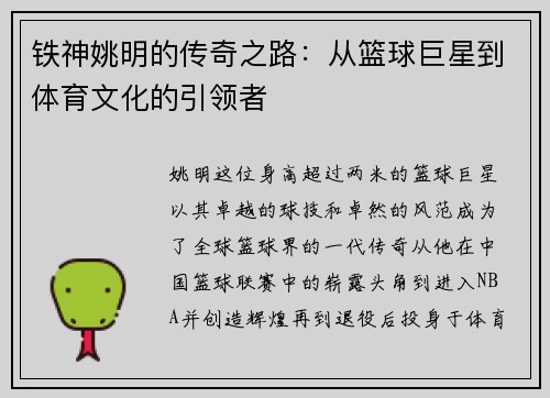姚明,作为中国篮球的传奇人物,其246厘米的身高不仅使他在篮球场上独树一帜,更是他的梦想与奋斗的象征。从青涩少年到NBA巨星,姚明用自己的努力和才华证明了身高并不是唯一决定运动员成就的因素。在这篇文章中,我们将从姚明的成长经历、职业生涯、对中国篮球的影响以及个人价值观四个方面,全面探讨这个伟大球员背后的传奇故事与对篮球梦想的不懈追求。姚明以其卓越的表现和坚定的信念,为世界展示了中国体育的魅力,同时...